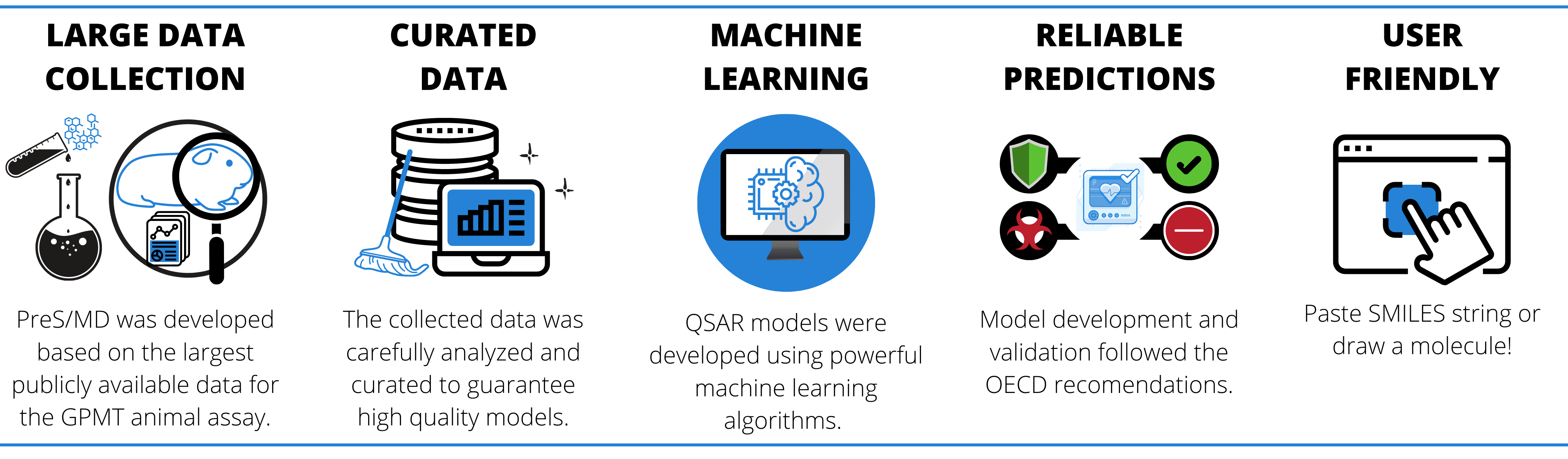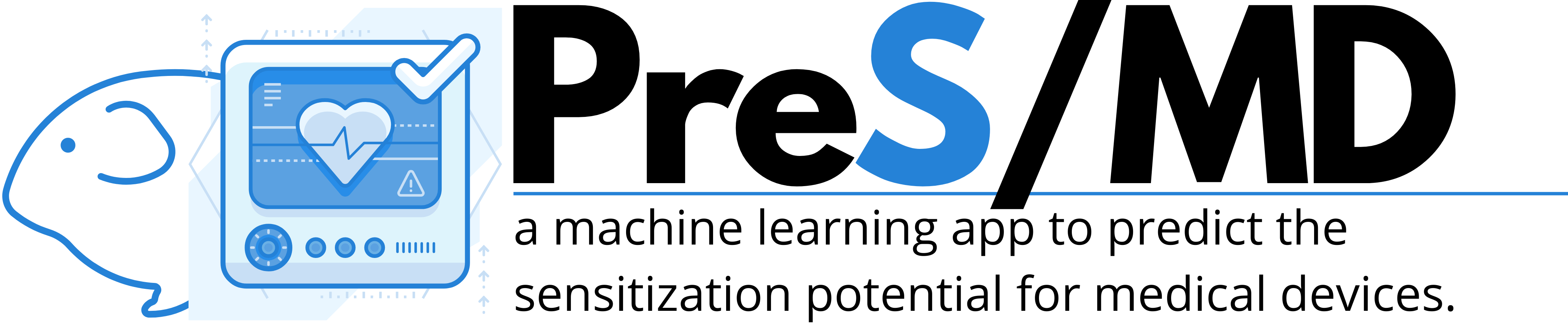 The PreS/MD application provides an alternative method for assessing the potential of chemicals to be putative skin sensitizers in the Guinea Pig Maximization Test (GPMT) (OECD TG 406). We pose this tool can be employed to predict the skin sensitization potential of medical devices. PreS/MD makes predictions based on Quantitative Structure-Activity Relationship (QSIR) models developed on the most extensive and properly curated dataset of GPMT. The models were developed in Python 3.9 using open-source chemical descriptors based on ECFP4-like circular fingerprints with 2048 bits and an atom radius of 2 (Morgan2) calculated in RDKit. QSAR models were developed using Light Gradient Boosting Machines (lightGBM) algorithm implemented in scikit-learn. The models were optimized using a Bayesian approach implemented in Scikit-Optimize. The models were generated applying the best practices for model development and validation widely accepted by the community.. For more information, please refer to our paper: Vinicius M Alves, Joyce V B Borba, Rodolpho C Braga, Daniel R Korn, Nicole Kleinstreuer, Kevin Causey, Alexander Tropsha, Diego Rua, Eugene N Muratov. "PreS/MD: Predictor of Sensitization Hazard for Chemical Substances Released From Medical Devices." Toxicological Sciences, Volume 189, Issue 2, October 2022, Pages 250-259, https://doi.org/10.1093/toxsci/kfac078.